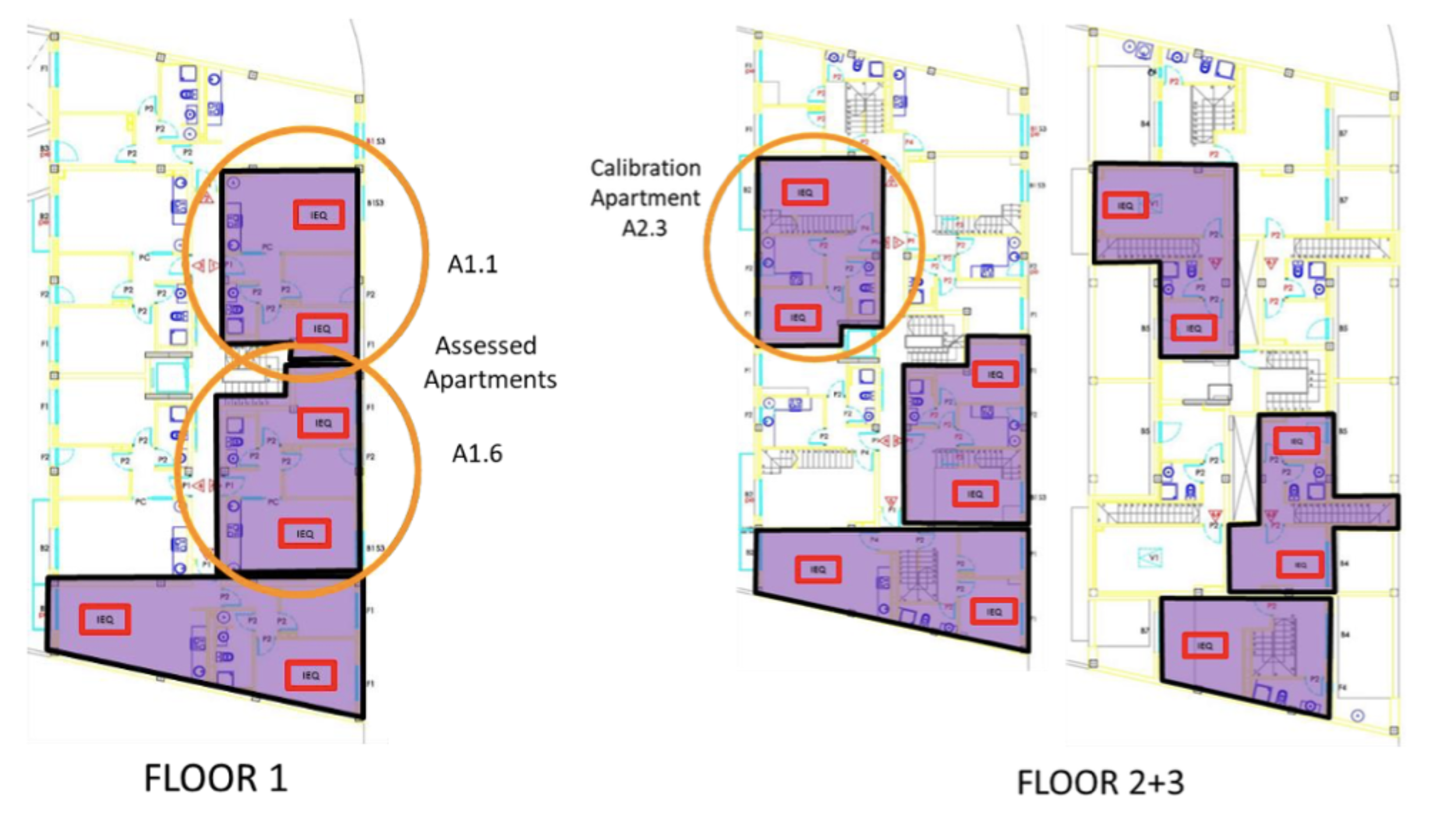 Monitored apartments in the Terrassa demo building, and location of the IEQ sensors